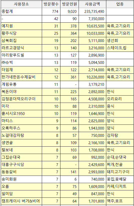 동두천시청의 시장, 부시장의 업무추진비 사용내역을 합산하여 분석한 내용입니다.