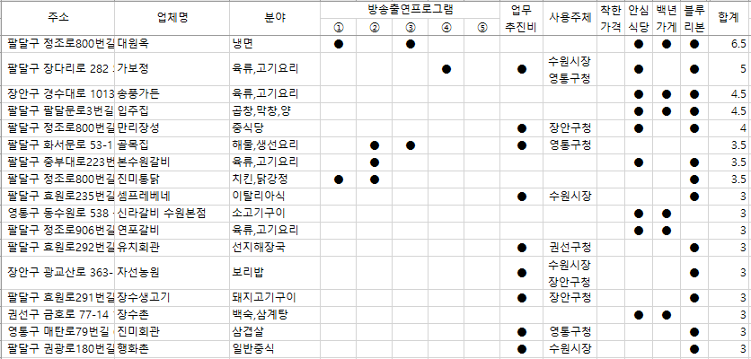 그 밖에 다양한 수원 맛집들이 있으니, 업체명 기준으로 검색을 하시면서 방문할 곳을 찾아보시기 바랍니다.
